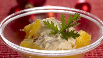 (4-6 pers.)100 g tørrede tranebær1 dl hvid rom50 g mandelsplitter4 pasteuriserede æggeblommer100 g flydende glucose (SuperBrugsen og Kvickly)125 g