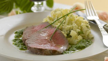 Gnid kødet med salt og peber og brun det på pande i smør. Kom alufolie om pandens håndtag og kødtermometer med spidsen ned midt i kødet. Sæt det i ovnen ved 100° og steg, til termometret viser 58°, ca. 1 time. Tag kødet ud og stil det koldt til næste dag.