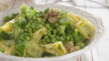 Rør dressingen sammen. Kog raviolien, og når den er næsten færdig, blancheres broccolien. Det drænes og blandes med ærter, forårsløg i skiver, nødder og salatblade samt dressing.