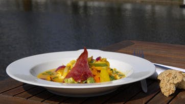 (4 pers.)200 g kartoffel i fine tern500 g rensede rodfrugter i tern el. passende stykker8 dl hønsebouillon2 g safran50 g smørSalt og peberFinthakket
