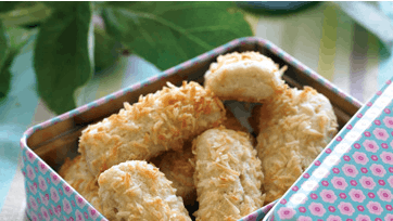 Hak mel og smør sammen og bland sukker og hjortetaksalt i. Ælt dejen sammen med rommen og tril den til fingertykke stænger. Skær stængerne i 6 cm lange stykker og pensl med æggehvide. Rul stykkerne i kokosmel og bag dem ved 175° i 10-15 min.