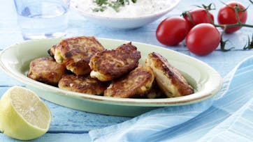 Kog kartofler møre som til mos uden salt. Mos dem og rør smørret i de varme kartofler. Skær indmaden ud af tomaterne og hak kødet i småbitte tern. Hak forårsløg og rør tomater, løg, mel, citronsaft og mynteblade i kartoffelmosen. Smag til med salt og peber. Lav små boller (valnøddestore), rul i mel og steg i olie. Server varme og sprøde som snack.