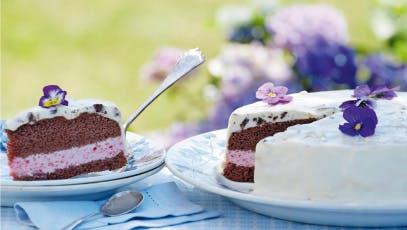 Få den lækre opskrift på den smukke hindbær-chokolade-islagkage
