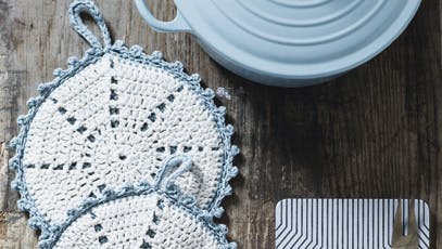 De hyggelige, nostalgiske grydelapper og den praktiske kartoffelvarmer er hæklet efter samme opskrift, bare med forskellige garntyper. Det er lige et projekt, man kan holde ud at sidde med i sommervarmen!