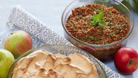 Bag æblekagen 15-20 min. ved 175°, til marengsen er gylden.