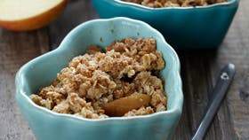 Skræl æbler, fjern kernehuset og skær dem i både. Kom æblebådene i et stort ovnfast fad eller 6 ovnfaste portionsskåle og drys med sukker og kanel. Riv marcipanen og fordel den over æblerne. Kom smør, byggryn, mel og rørsukker i en foodprocesser og lad den køre, til dejen er godt blandet og samlet i små klumper. Fordel smuldrdejen over æblerne og bag kagen ved 200° i 30 min. Server kagen lun med koldt flødeskum eller cremefraiche.