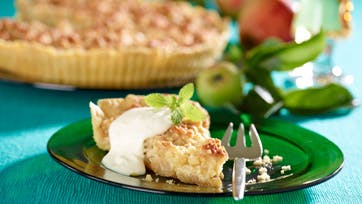 Tosca: Skold og smut mandlerne og hak dem fint. Smelt smørret i en gryde. Tilsæt sukker og mel, mandler og fløde. Giv blandingen et kort opkog. Fordel æblerne i bunden og dæk med toscablandingen. Bag æblekagen ved 200° i den nedre del af ovnen 20-25 min.