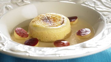 Kom små skrællede æblestykker i en gryde med smør og sukker. Når det er karamelliseret og grødagtigt, kommes det i bunden af 4 smurte ringe (købes i specialbutikker), der er foret med et rør af bagepapir. Kan også kommes i små portionsspringforme med løs bund. Afkøles. Æggeblommer til cremen piskes meget lysegule med sukker. Vaniljestangen koges med fløden, der hældes over æggene, bringes atter til ca. 80°, den udblødte husblas smeltes i cremen, og det hele sies. Hældes i formene med æblebunden. Afkøles til næste dag, før de skubbes forsigtigt ud. Drysses med sukker og brændes med creme brûléebrænder. Sættes i dybe tallerkner med små røde æblecirkler, og cidersovsen hældes ved.