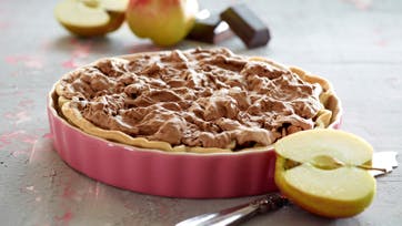 Pisk æggehvider stive med sukkeret og vend forsigtigt chokoladen i. Fordel chokolademarengsen over æblefyldet og bag tærten ved 175º i 25 min. Server æbletærten lun med kold cremefraiche.
