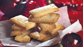 Smuldr smør og mel. Tilsæt appelsinskal og sukker og ælt dejen sammen. Lad den hvile i køleskab 2-3 timer. Rul dejen ud med kagerulle i 1/2 cm tyk plade og skær den i stænger på ca. 5 x 2 cm. Læg dem på plade med bagepapir, og bag dem ca. 10 min. ved 200° på midterrillen.