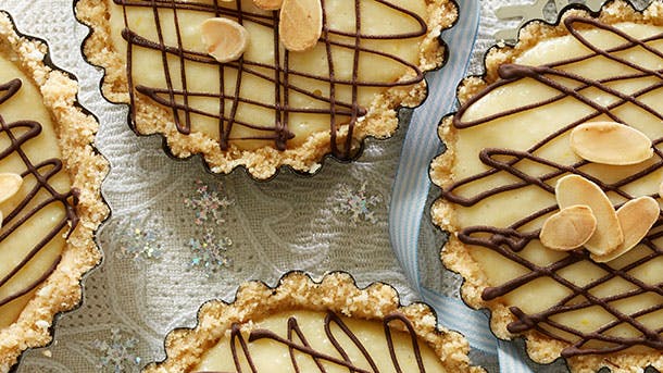 Dekorér tærterne med den smeltede chokolade og mandelflager.