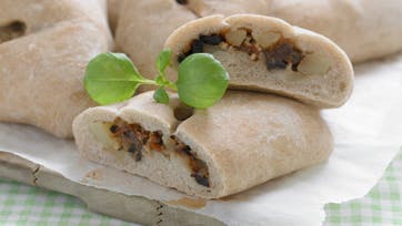 Rør gæren ud i vandet og tilsæt salt, olie og speltmel. Tilsæt hvedemelet, rør dejen godt igennem og stil den på køl natten over. Skær kartoflerne i tern og bland dem med oliven, tomat, hytteost, salt og peber. Del dejen i 12 stykker og rul dem ud til små cirkler. Fordel kartoffelfyldet på dejcirklerne, fold dejen sammen om fyldet og klem samlingen godt sammen. Læg brødene på en bageplade beklædt med bagepapir og lav et par snit i hvert brød. Pensl brødene med olie og bag dem ved 190° i 20 min.