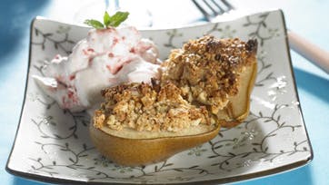 Halver pærerne og fjern kernehusene. Blend smør, makroner, mandler og sirup til en ensartet masse. Læg pærerne i et ovnfast fad og fordel mandelmassen over. Bag pærerne i ovnen ved 175° i 12-15 min. Bland fløde og vaniljesukker og pisk det til skum. Blend hindbærrene og vend dem i flødeskummet. Server de lune pærer med det kolde hindbærskum og pynt med lidt citronmelisse.