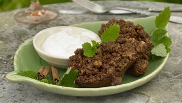 Bland mel, kakao og rørsukker og hak smørret i til en usammenhængende smuldredej. Halver pærerne, fjern blomsten og kernehuset og læg dem med skærefladen opad i et ovnfast fad. Skær nougaten ud i 6 stykker og læg dem i hullerne efter kernehusene. Fordel smuldredejen over pærerne og bag dem ved 180° i 25 min. Bland cremefraiche og yoghurt og rør kanel i. Server pærerne lune med den kolde kanelcreme.