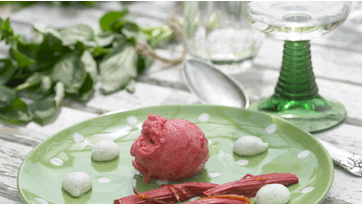 Sorbet: Skær rabarberne i mindre stykker. Kog dem med lidt vand, sukker og flækket vaniljestang. Kog, til det er mørt, og rør det ensartet. Kør det på ismaskinen eller frys det og blend det og frys det igen.