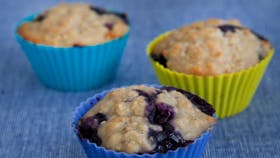 Mos banan ned i en skål. Kærnemælk, olie og æg røres i bananerne. Bland mel, havregryn og natron i en anden skål. Bland de 'våde' ingredienser med de tørre og rør hurtigt rundt med en træske. Blandingen vil se lidt klumpet ud, men rør ikke for meget. Bland de optøede blåbær i. Smør en muffin form med plads til 12 stk. Bages i 18-20 minutter på 180 grader.