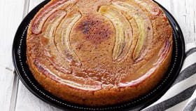 Rør smør, farin og vanilje sammen og pisk æggene i et ad gangen. Mos en af bananerne og rør den i dejen sammen med yoghurten. Sigt melet og vend det i sammen med bagepulver og mandler. Smør en 20 cm rund bageform med smørret og hæld siruppen i formen. Halver bananerne, læg dem i bunden af formen og hæld forsigtigt dejen over. Bag kagen ved 160° i 60 min. og lad den afkøle lidt. Vend kagen ud på et fad, giv evt. et par min. under grillen, hvis den ikke er helt karamelliseret, og server.