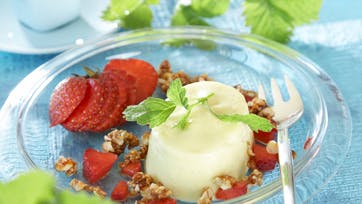 Skyl og nip jordbærrene. Skær dem i skiver eller tern og bland dem med lidt sukker. Vend bavaroisen ud på tallerkner og server med jordbær og nøddedrys.