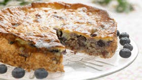 Skyl og evt. nip blåbærrene. Læg dem på kagen. Pisk æggeblommer meget luftige med sukker og vaniljekorn - det tager ca. 10 min.