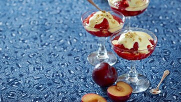 Knus makronerne let, kom dem i glas og hæld portvin over. Halver blommerne, damp dem med sukker i ca. 7 min., til de er let møre, men ikke mosede, afkøl dem. Kom blommerne over makronerne. Pisk æggeblommerne luftige med vaniljekorn og sukker. Pisk fløden stiv og vend æggeblandingen i. Hæld råcremen over blommerne. Stil desserten koldt. Pynt med lidt mynte ved servering.