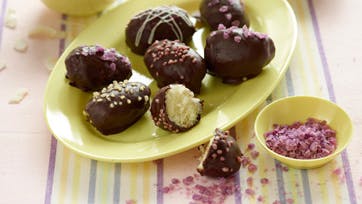 Rør mascaponen med limesaft og flormelis, til den er glat og cremet. Tilsæt kokos og rør det godt sammen. Form kokosblandingen til små æg med en teske og stil dem på køl i 1 time. Smelt chokoladen, overtræk æggene med mørk chokolade og dekorér med hvid chokolade og violer.