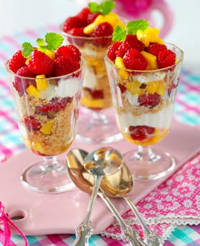 - Knus kiksene og læg dem lagvis med frugt og ostecreme i 4 glas.