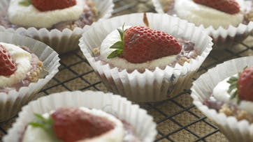 Knus kiksene i foodprocessor. Smelt smørret og bland det med kiksene. Tryk dejen ud i 8-10 engangsmuffinforme, så dejen dækker bunden og kanterne. Sæt formene i køleskab 10-15 min. Fyld: Rør citronskal, saft, ricotta, cremefraiche, æg, flormelis og jordbærsyltetøj sammen. Fyld cremen i formene. Bag dem på midterrillen ved 150° ca. 30 min. Køl kagerne på bagerist. Rør icing sammen og kom den på kagerne. Pynt med jordbær.