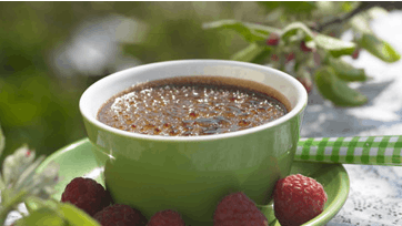 Bland piskefløde og cremefraiche, flæk vaniljestangen og tilsæt den. Varm blandingen igennem over vandbad under omrøring. Tag vaniljestangen op og smelt chokoladen i den varme fløde. Rør blandingen igennem, til den bliver helt glat, og tag den af varmen. Pisk æggeblommerne med sirup og tilsæt chokoladeblandingen lidt ad gangen, mens der piskes. Varm cremen igennem over vandbad under omrøring, til den tykner. Fordel hindbærrene i bunden af 5 ovnfaste portionsskåle og kom cremen over. Stil skålene på køl i mindst 3 timer, til massen er stivnet. Drys sukkeret over desserterne og karamelliser det med en gasbrænder eller under grillen i ovnen.