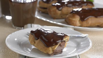 Smelt smørret i vandet i en gryde (ikke koge). Pisk melet i og tag det straks af varmen. Rør i 3 min., til det er glat. Pisk æggene sammen og pisk dem i dejen lidt ad gangen, så dejen bliver formbar, men ikke flydende. Afsæt stænger på ca. 10 cm med sprøjtetylle og bag dem ved 200° i 25 min. Afkøl. Lav imens cremen ved at piske alting, undtagen chokolade sammen over lav varme, til det tykner. Når der er slukket, tilsættes chokolade, så det smelter. Afkøl helt og kom i tylle, der fyldes i rørene.
