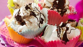 Bland æggehvider og sukker i en skål. Sæt skålen i vandbad og varm op til ca. 60-65°, mens du pisker. Det er vigtigt, at både skål og piskeris er rene og tørre, når du skal piske marengsen. Tag skålen af varmen og pisk, mens marengsen køler af. Smelt chokoladen og hæld den over marengsmassen og vend rundt en gang eller to. Kom marengsmassen i 7-8 muffinsforme. Bag kagerne ved 125° i ca. 1 time.