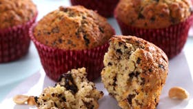 Pisk smør og sukker let og luftigt. Tilsæt æggene et ad gangen. Bland mel og bagepulver og rør det i dejen. Hak chokolade og peanuts og rør dem i dejen sammen med mælken. Fordel dejen i 12-15 muffinsforme, der skal være ¾ fyldt op. Bag dem i ovnen ved 200º i ca. 15-20 min.