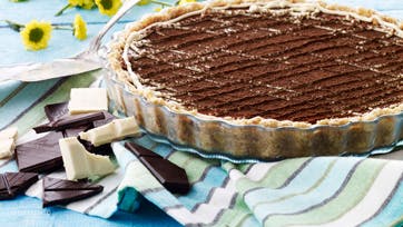 Rør kaffen ud i vandet og rør den i osteblandingen. Rør æggene i et ad gangen, vend chokoladen i og fordel blandingen over tærtebunden.