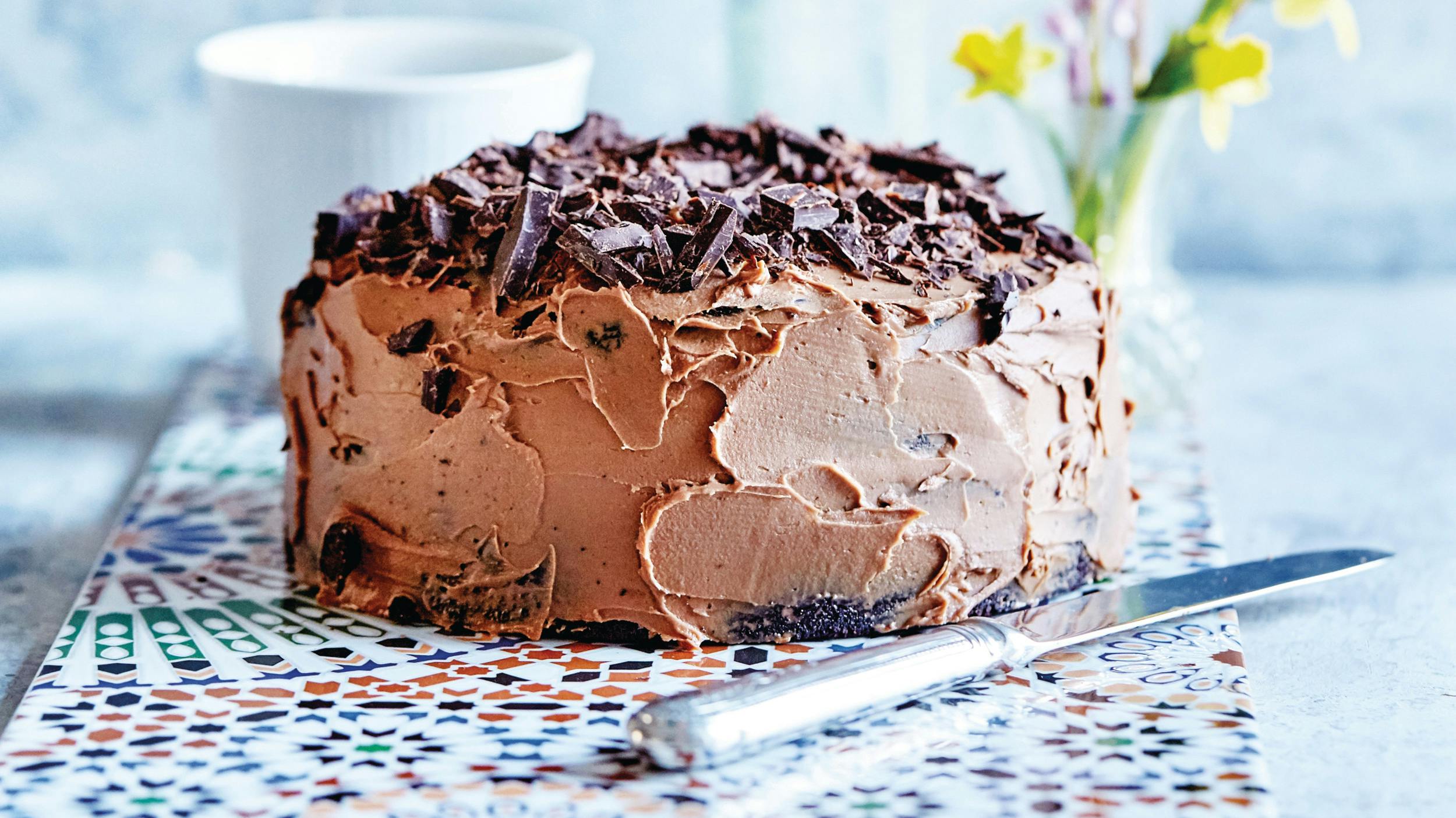Pisk trøffelcremen op, og fordel halvdelen på den nederste lagkagebund. Læg den anden lagkagebund ovenpå. Smør resten af trøffelcremen på toppen og siderne af kagen. Pynt rundhåndet med hakket chokolade.