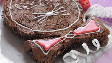 Pisk æg og sukker sammen. Smelt smørret. Hak nødder og chokolade. I sukkermassen blandes mel, vaniljesukker, bagepulver, kakao, de hakkede nødder og chokoladen. Til sidst røres det smeltede smør i. Kom dejen i en lille bradepande, der er foret med bagepapir og bag ca. 40 min. ved 170°. Skær ud, så det ligner en fastelavnskat.