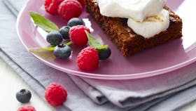 Sigt mel, bagepulver, natron og salt ned i en skål. Rør skiftevis chokolade- og melblandingen i æggeblandingen, lidt af gangen. Hæld dejen i et smurt ildfast fad til cirka 1,2 liter.