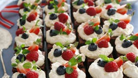 Skær kagen ud i firkanter og pynt med flødeskum og bær.