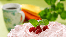 Hindbærfløde: Pisk fløden med sukker. Vend de let optøede hindbær i flødeskummen. Kom cremen på kagen lige inden serveringen.