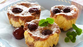 Knus chokoladecookies, tilsæt æg og arbejd dejen sammen. Tryk dejen ud i portionsforme og bag dem 8 min. ved 175°. Rør flødeost og vaniljekvark sammen og tilsæt æggene et ad gangen. Smelt og afkøl chokoladen. Fyld formen halvt op med osteblandingen. Tag lidt kirsebær fra til pynt. Fordel chokoladen og kirsebærrene i formene og pynt til sidst med kirsebær. Sæt kagerne på nederste rille i en 175° varm ovn og bag dem 12 min. Fyldet behøver ikke være stift, det stivner under afkøling. Afkøl ved stuetemperatur og sæt dem derefter i køleskab mindst en time inden servering.
