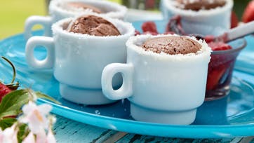 Rens rabarberne og damp dem under låg med sukker og vand. Skær jordbærrene i tykke skiver og kom dem i, når rabarberne er møre, og sluk. Afbag mel med smør og spæd med mælk, sukker og vaniljekornene. Hæld afbagningen over den hakkede chokolade og afkøl. Rør æggeblommerne i chokolademassen, pisk hviderne stive og vend dem i massen. Kom det i små, smurte og sukkerdryssede forme og bag ved 200º varmluft i 20 min. Servèr straks med rabarber og jordbær.