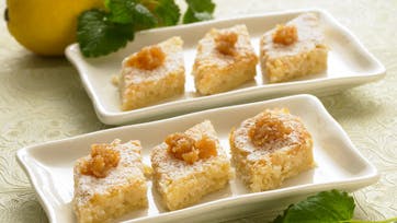 Bland mel, bagepulver og sukker og smuldr smørret heri. Saml dejen, rul den ud i en firkant på 20 x 20 cm og læg den i en bageform. Bag bunden ved 180° i 20 min. og lad den afkøle lidt. Pisk æg, sukker, mel, bagepulver og citronsaft sammen og fordel det over bunden. Bag i yderligere 25 min. og lad den køle af. Skær kagen ud i 20 ruder og drys med flormelis. Kom lidt marmelade på hvert stykke og server.