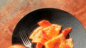 Rør ingredienserne til saucen sammen i en gryde og bring det i kog under omrøring. Pil appelsinerne og del dem i både. Anret pandekagerne med appelsinbådene og saucen.