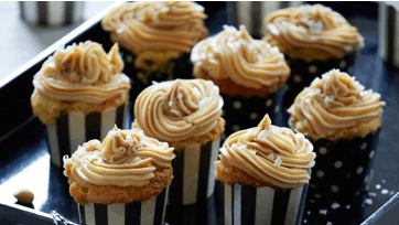 Rør ost med flormelissen, til det er glat, og rør mælk og peanutbutter i. Fold karamelsovsen i, så den danner lidt striber, og fordel glasuren over de afkølede muffins. Dette kan med fordel gøres med sprøjtepose. Drys med en anelse flaget havsalt.
