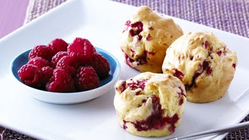 Rør æg og mayonnaise sammen i en skål. Bland mel, skummetmælkspulver og bagepulver sammen, vend det i dejen og rør godt rundt. Vend herefter forsigtigt halvdelen af hindbærrene i dejen (resten bruges til pynt). Smag dejen til med sødemiddel. Smør formen med fedtstoffet, fordel dejen i 4 muffinsforme og bag dem i en 200° varm ovn i ca. et kvarter. Lad muffinsene afkøle og server dem eventuelt med en klat yoghurt og pynt med resten af hindbærrene.