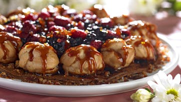 Dyp vandbakkelserne i karamel og sæt dem langs bunden som en sprød kant. Øs lidt karamel over vandbakkelserne. Dryp resten af karamellen på et stykke bagepapir og lad den stivne. Knus karamellen med kødhammer. Fordel cremen i midten af kagen. Pynt med bærrene og den stivnede karamel.