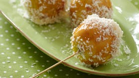 Vask og skrub æblerne og puds dem tørre. Stik en pind i bunden af hver. Kom sukker, vand og eddike i en gryde og bring i kog. Når det koger med seje bobler og måler 120º, vendes æblerne et ad gangen heri og drysses med kokos. Afkøles og spises samme dag.