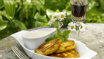 Skær ananassen i skiver og bland hyldeblomstsaft, balsamico og rørsukker til en marinade. Hæld marinaden over ananasskiverne og lad dem trække i en time. Pisk æggeblommer, flormelis og kornene fra vaniljestangen lyst og luftigt og rør flødeost i. Rør hyldeblomstsaften i lidt ad gangen og stil cremen på køl. Grill ananasskiverne et par min. på hver side og server dem lune sammen med den kolde ostecreme.