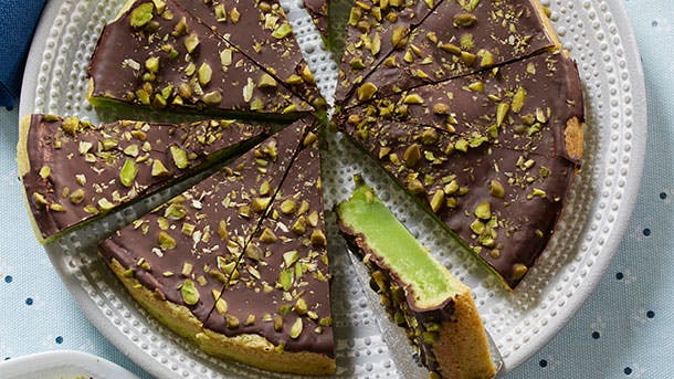 Mmm... Denne lækre mazarinkage er overtrukket med mørk chokolade og toppet med pistacienødder. Bedre bliver det næsten ikke!