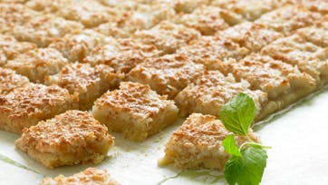 Smør æblemosen på bunden, fordel kokosmassen over og glat den ud. Bag kagen i yderligere 15 min. øverst i ovnen, skær kagen i firkanter eller snitter og lad dem afkøle helt på pladen.