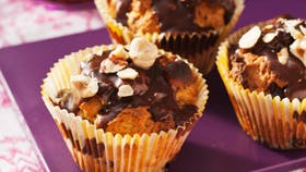 Hak hasselnødder og chokolade groft. Bland alle de tørre ingredienser. Smelt smørret, rør mælk og æg i og pisk de tørre ingredienser i. Kom dejen i 16 muffinsforme og bag kagerne ved 225° i ca. 20 min. Lad dem afkøle på en rist.