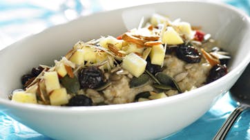 Havregryn og mælk koges sammen til en lind grød, der drysses med solsikkefrø, græskarkerner og fintsnittede mandler samt frisk æble i små tern. Dette er en både velsmagende og meget sund dessert. En enkelt portion på 100 g indeholder 20 g protein og en masse andre sunde næringsstoffer.